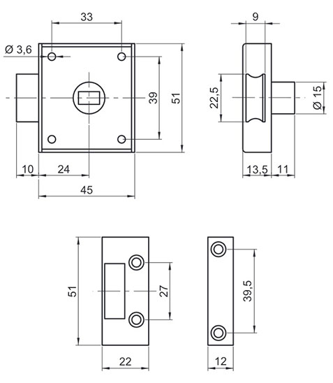 • Pène et fouillot rectangle 6x10 Ø15, haut. 12