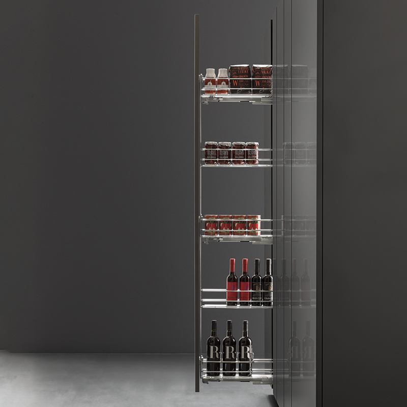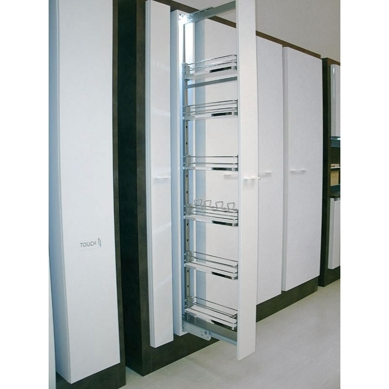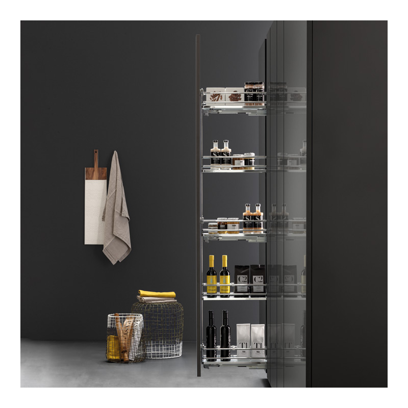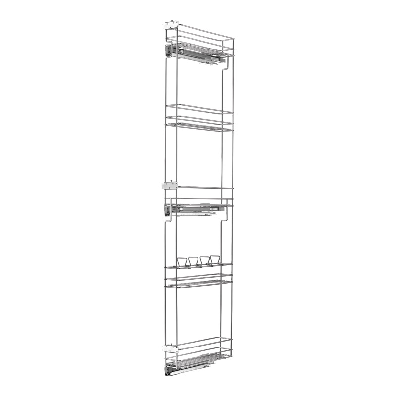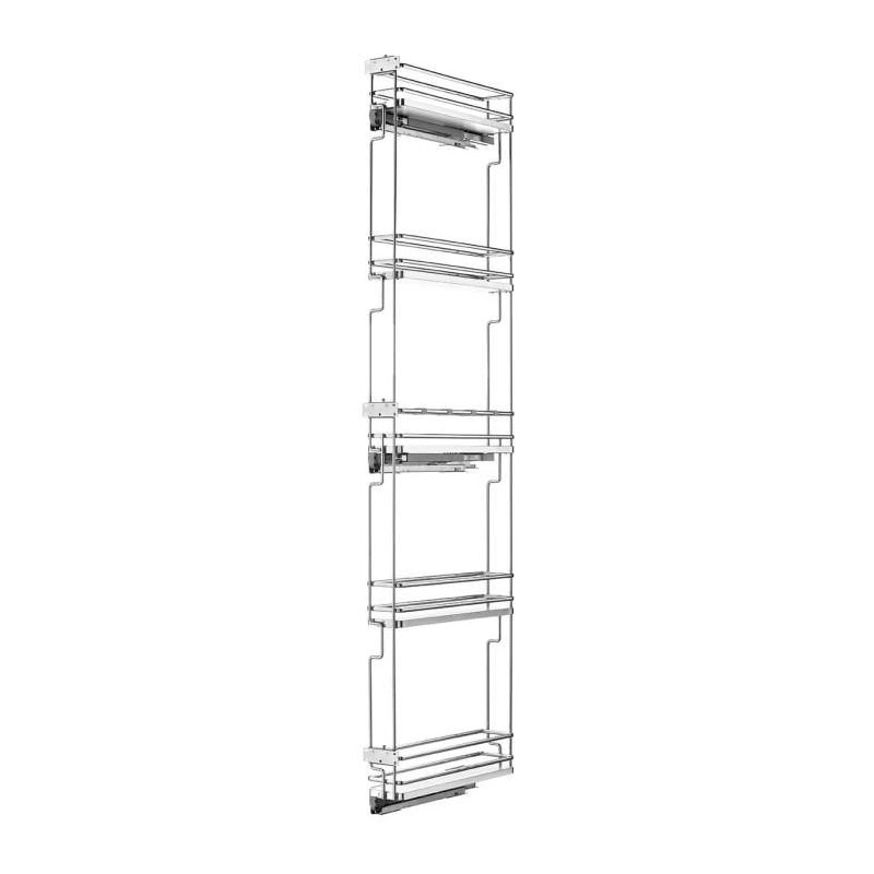 - Equipé de 5 corbeilles fixes en fil d’acier chromé, 3 coulisses à sortie totale et 3 attaches façade