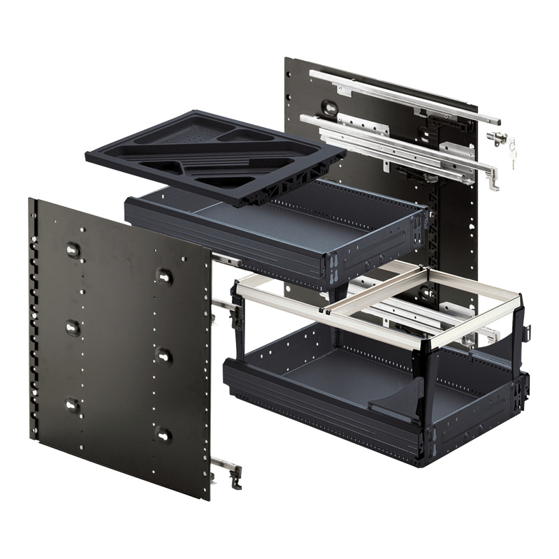 Coulisses et verrouillage sont prémontés. Chaque tiroir possède un réglage façade 3D. Hauteur intérieure caisson 509 soit 7HE+1.