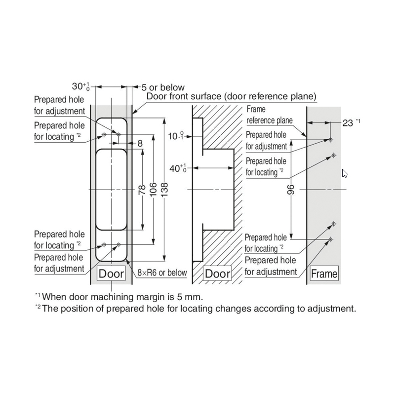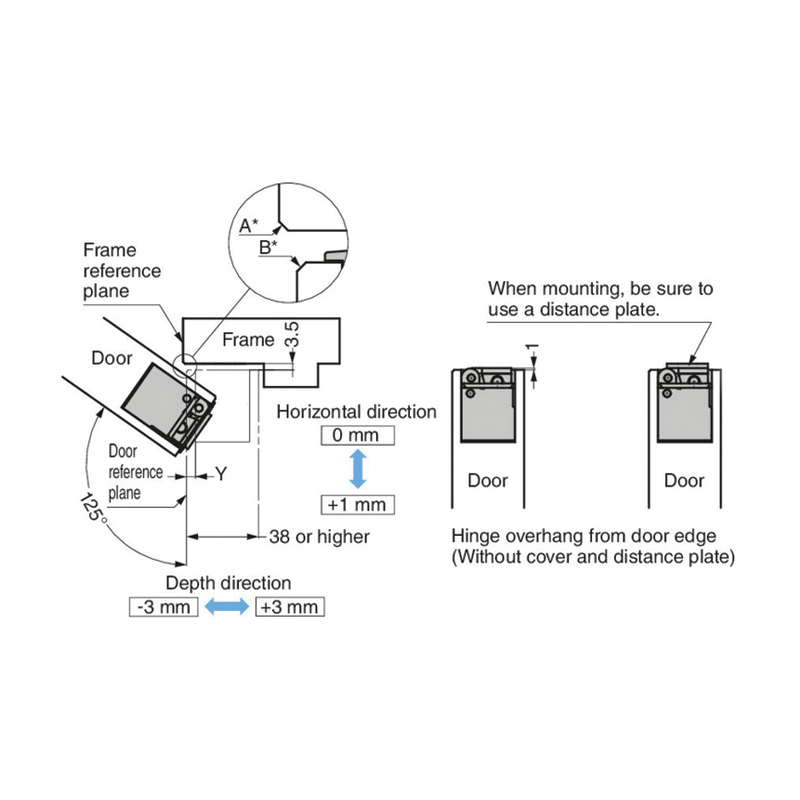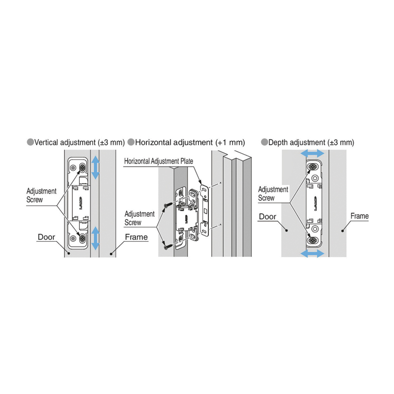 Réglage 3D (vertical, horizontal et en profondeur) après installation de la charnière.