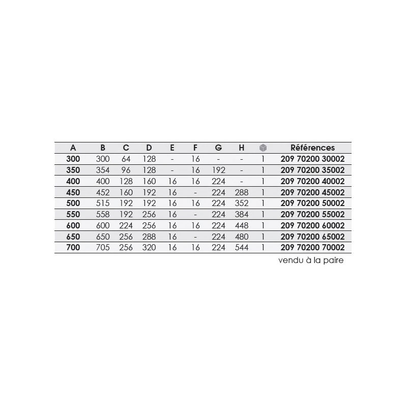 | Référence | A | B | C | D | E | G | Longueur | Dispo. | Prix TTC | UV | Unité de Vente | Qté | |