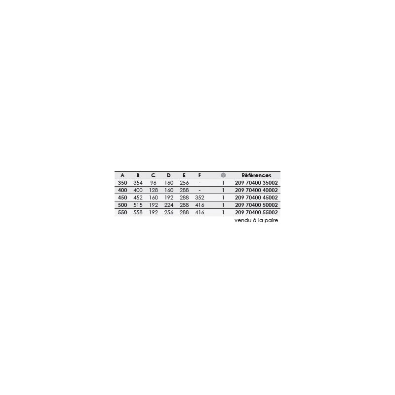 | Référence | A | B | C | D | E | F | Longueur | Dispo. | Prix TTC | UV | Unité de Vente | Qté | |