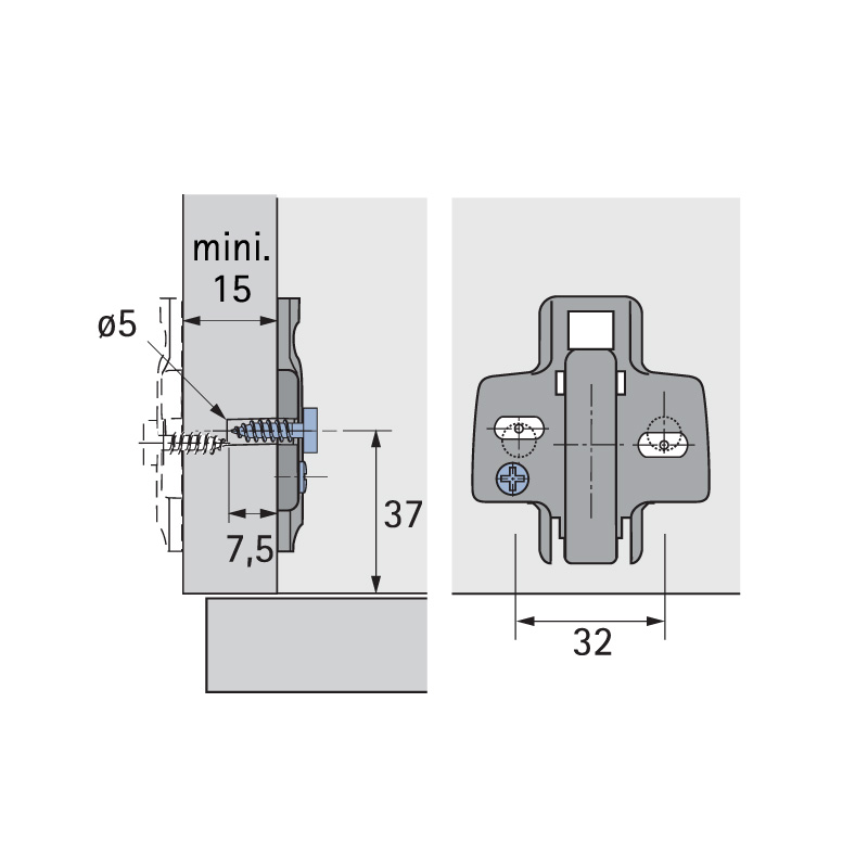 Elle est destinée aux charnières Sensys et Intermat et prévue pour des perçages de Ø5 x 7,5 mm.