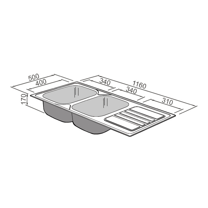 Evier 2 bacs + 1 égouttoir dimension 1160x500.