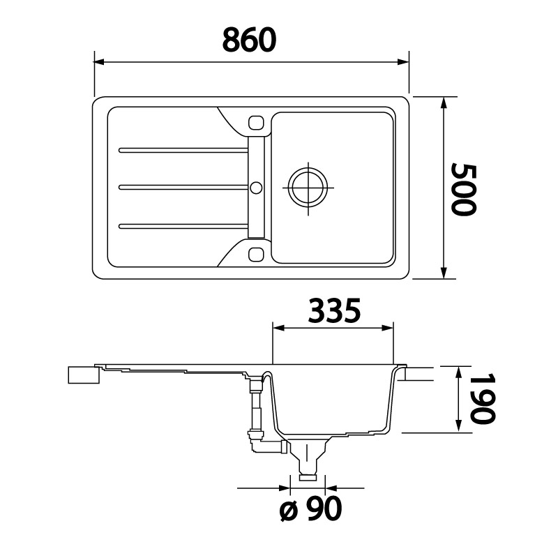 Livré avec fixations, siphon et bonde inox Ø90mm.