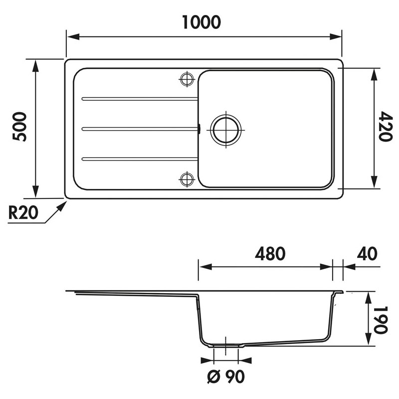 Livré avec fixations, siphon et bonde inox Ø90mm.