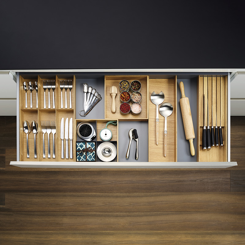 Cette extension pour tiroir de marque KESSEBOHMER est conçue pour tiroir d'une profondeur supérieure à 500 mm. Il est possible de recouper en largeur et en profondeur.