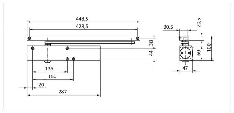 Ferme-porte en applique pour les portes battantes à 1 vantail et simple action. Montage réversible droite/gauche, côté paumelles ou opposée paumelles.