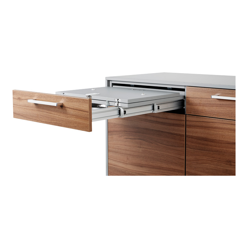 Permet une extension du plan de travail, facilement dissimulable lorsqu'elle n'a plus d'utilité.