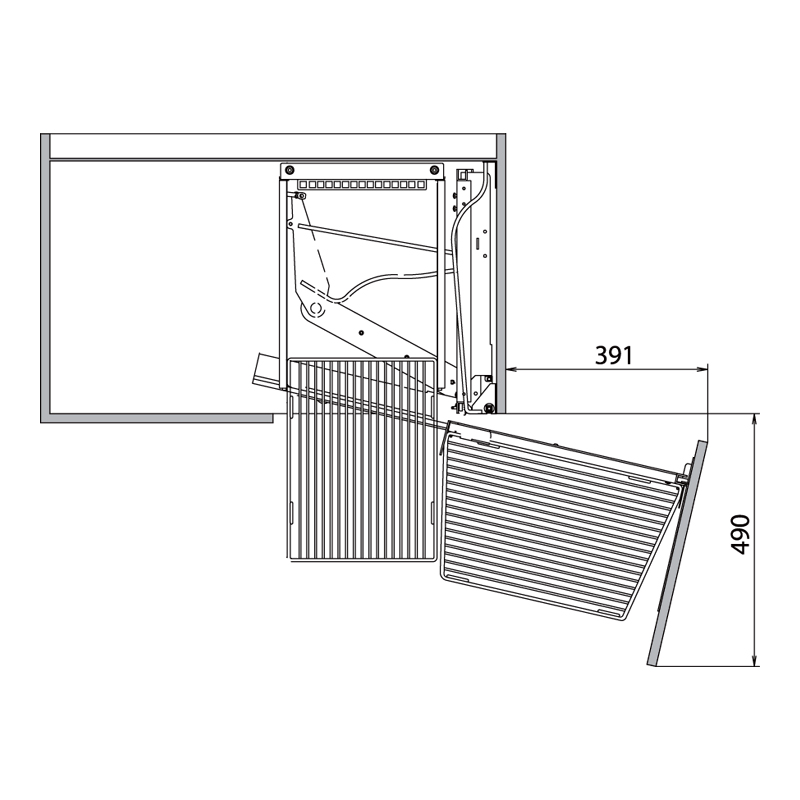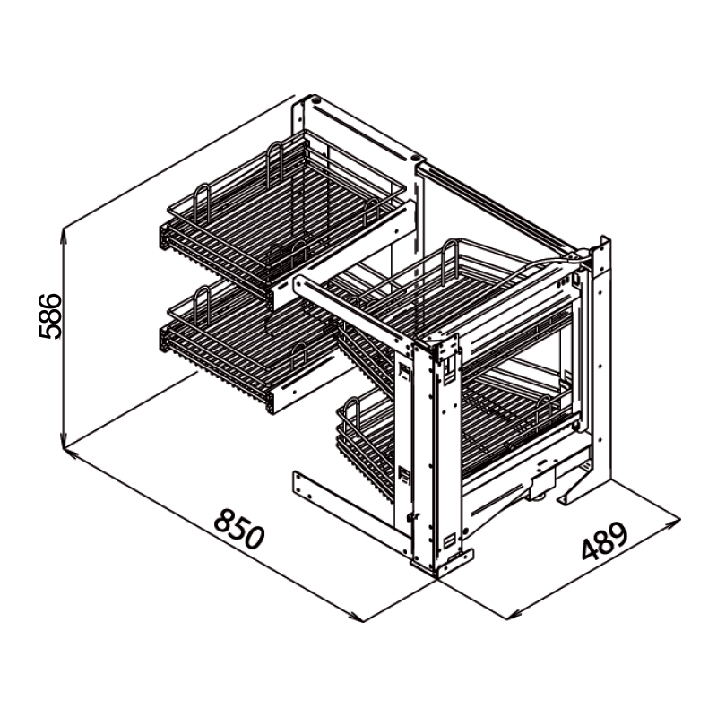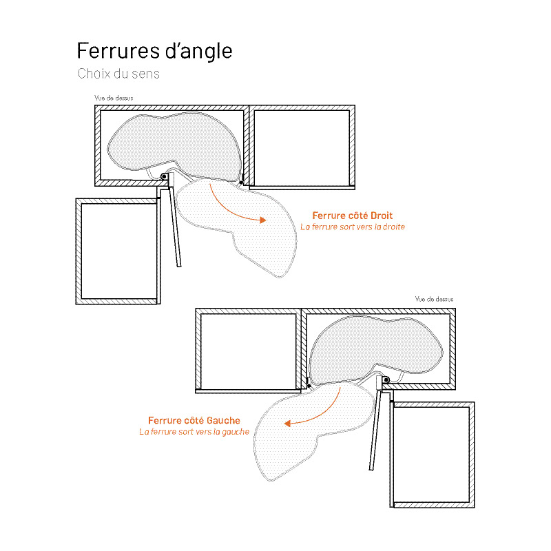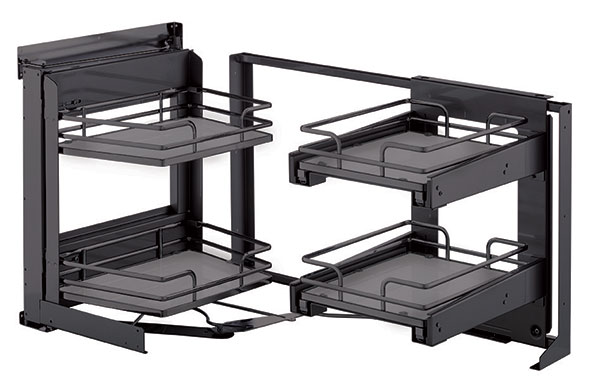 L’ouverture de la porte entraine l’extraction du cadre pivotant faisant ainsi coulisser face à l’ouverture les corbeilles situées dans l’angle mort du meuble permettant ensuite de les extraire vers l’extérieur.