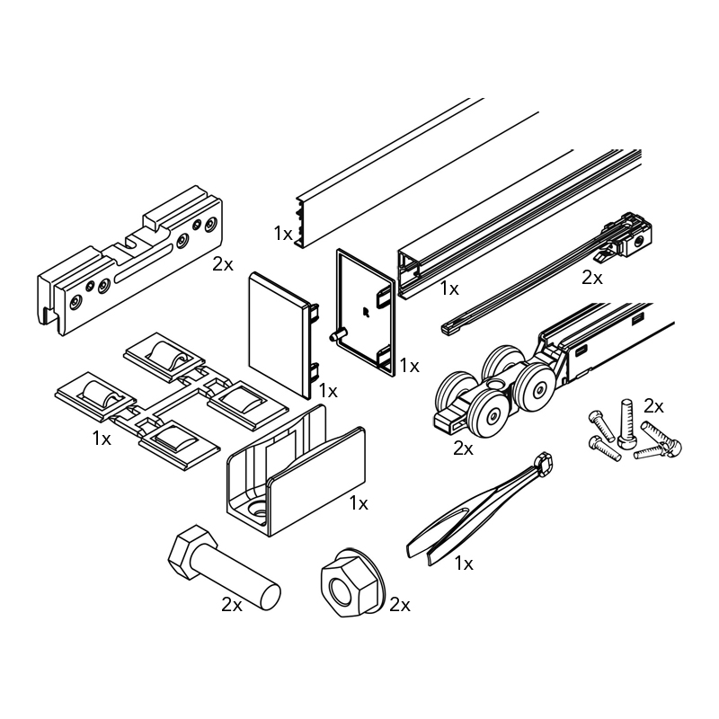 La garniture complète avec rail pour un vantail comprend :