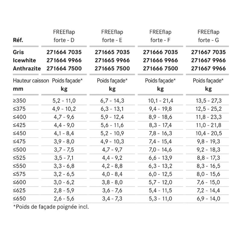 - FREEflap forte F : charge de 5.3 à 21.4 kg