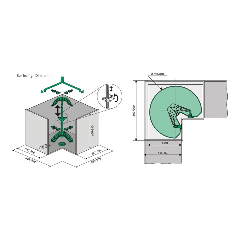 Cette dernière est destinée aux caissons d'angle de 800 ou de 900 mm et dispose d'un amortisseur Soft Stop.