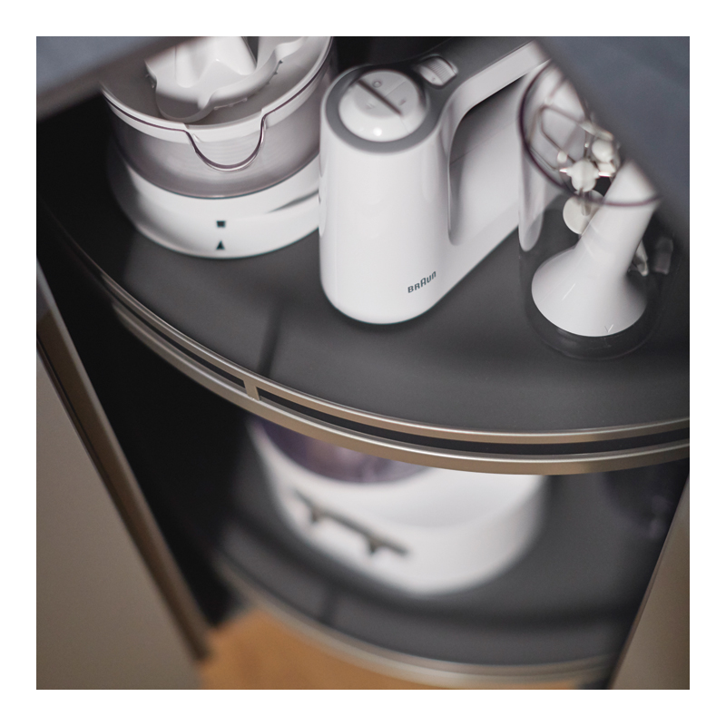 Réalisez l'installation de plateaux dans votre meuble bas grâce à la ferrure REVO 90 seule de marque KESSEBOHMER.