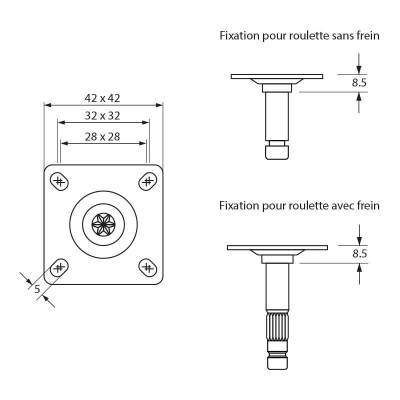 Fixation platine 42 X 42 pour roulette D.75 avec frein.
