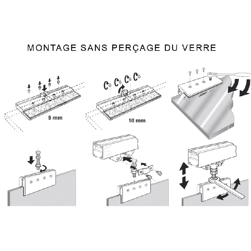 Ferrure de porte coulissante pour panneaux verre jusqu'à 80kg. Epaisseur de verre 8 à 10 mm.