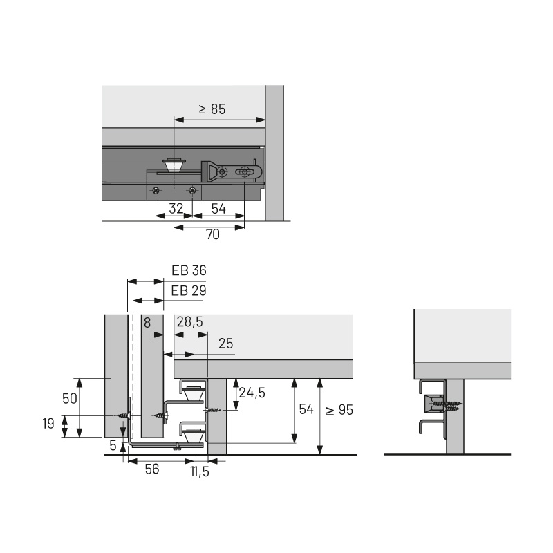 Garniture comprenant les guides inférieurs pour montage avec rail de guidage.