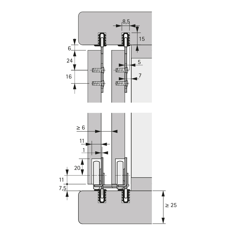 Des butées, des entretoises (a monter au centre de la porte coulissante) et des dispositifs d'arrêt centraux viennent compléter la ferrure de porte coulissante.
