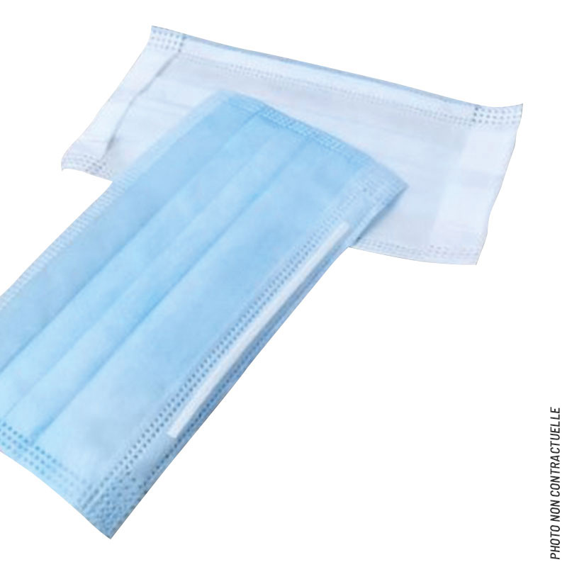 3 Couches non tisées avec serre nez métallique et élastiques de maintien aux oreilles.