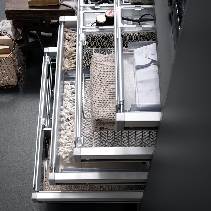 La gamme de produit ELITE est composée de cadres coulissants modulables, paniers coulissants, portes pantalons, porte cintres, porte chaussures, porte cravates, miroirs ainsi que diverses options.