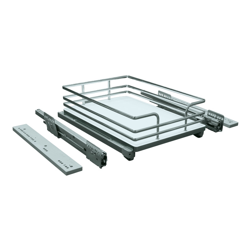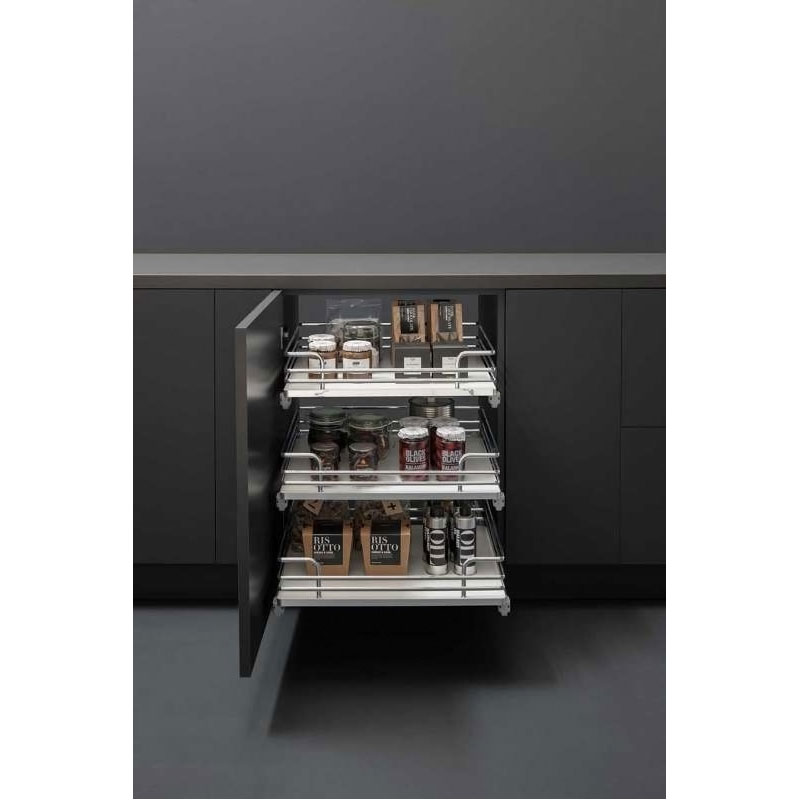 Avec une galerie réalisée en fil chromé, les paniers se montent sur des coulisses à billes à sortie totale avec un amortisseur pour un fonctionnement souple et fluide. Ces paniers peuvent supporter une charge maximale de 30 kg.