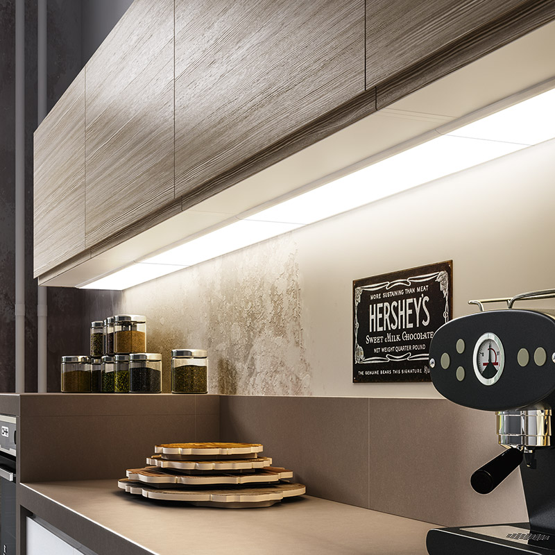 - Se pose sous les éléments hauts de cuisine sous un bandeau, en façade ou sous une tablette