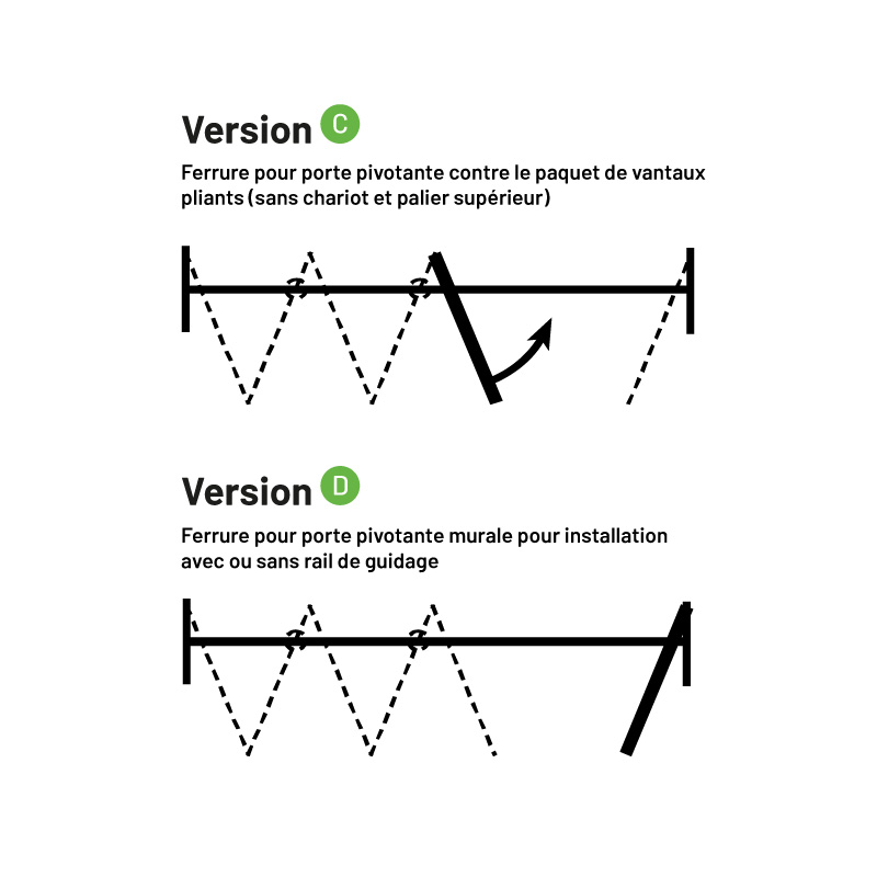 Il est possible de compléter avec une porte pivotante le paquet de vantaux pliants ainsi que le côté opposé.
