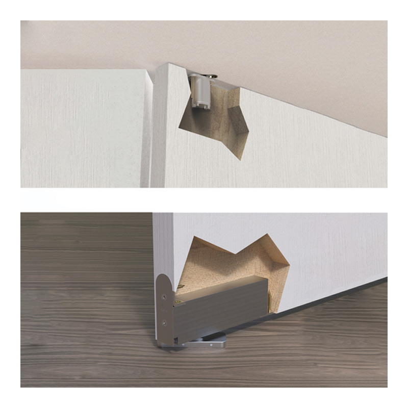 La charnière pivotante PIVOTICA est un système invisible à monter dans la porte (haut et bas).