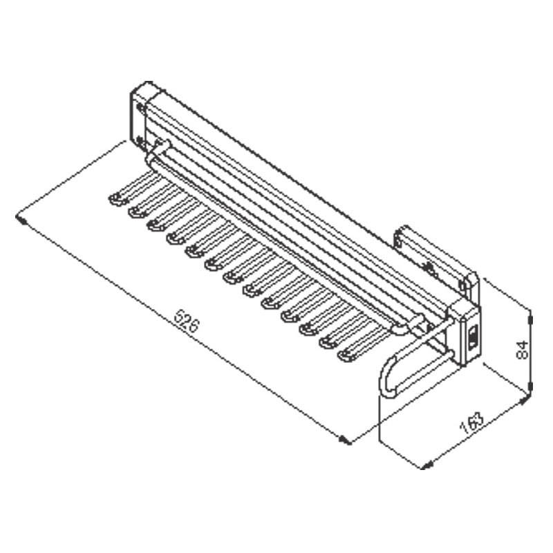 Ce porte-ceintures et cravates est réalisé en fil d’acier gris et est à fixer sous tablette. Il est livré avec fixations. Sa largeur est de 163 mm, sa profondeur de 526 mm et sa hauteur de 84 mm.