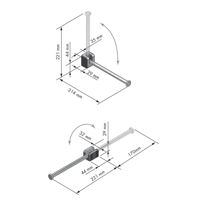 - En montage avec platine fermée sur un bout (mode relevable) : profondeur dépliée 214 mm