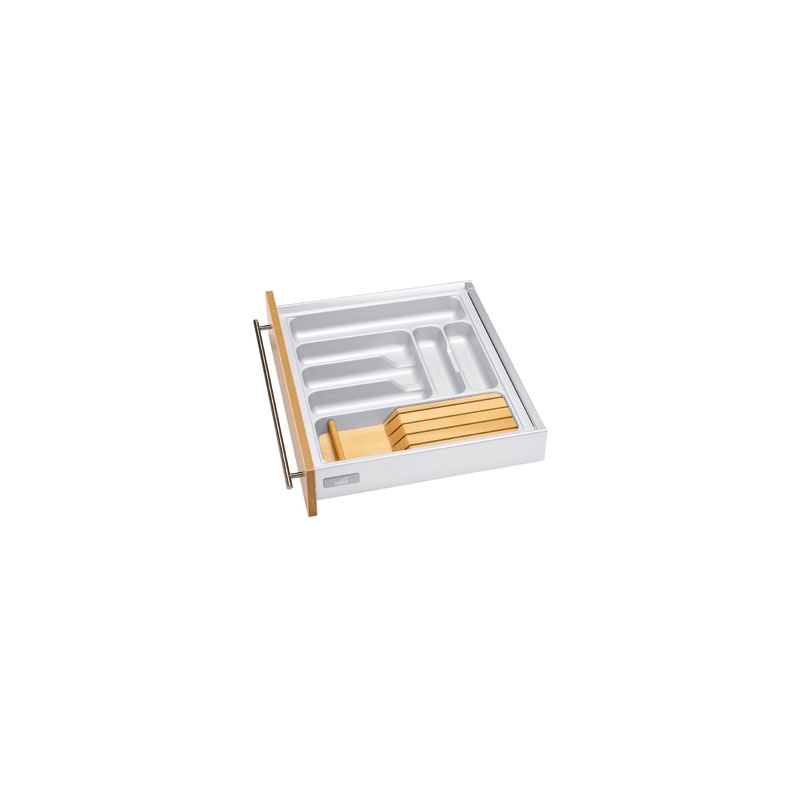 Esthétique et pratique, ce porte-couteaux de marque HETTICH s'incorpore facilement dans les tiroirs Atira de profondeur mini 470 équipant des caissons de largeur mini 500mm pour un meilleur rangement.