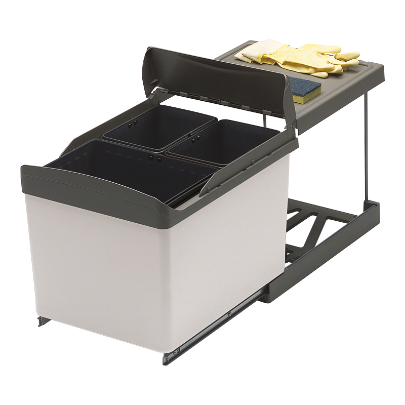 - Son amortisseur permet une fermeture en douceurPermet d’effectuer le tri sélectif directement dans votre cuisine.Elle est équipée de coulisses à billes à sortie 3/4 et est à sortie manuelle ou automatique avec relevage du couvercle