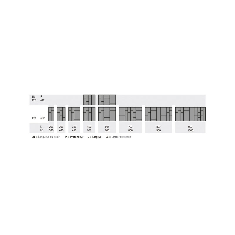 | Référence | Largeur | Pour caisson de largeur | Pour tiroir de profondeur | Dispo. | Prix TTC | UV | Unité de Vente | Qté | |