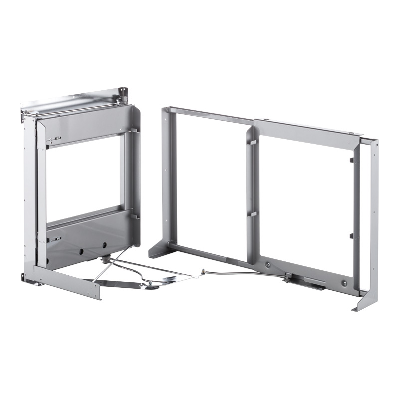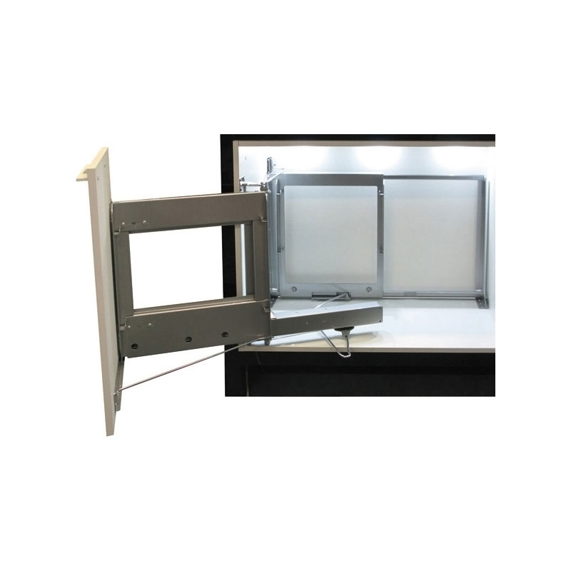 L’ouverture de la porte de ce rangement entraîne l’extraction du cadre pivotant faisant coulisser face à l’ouverture la partie de la ferrure située dans l’angle mort du meuble (ouverture assistée).