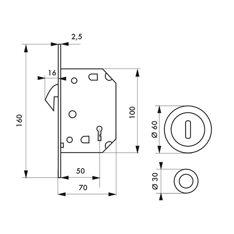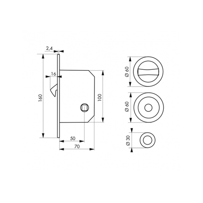 Gâche plate acier et rosaces encastrables à collerettes rondes Ø60 mm (encastrement Ø48 mm).