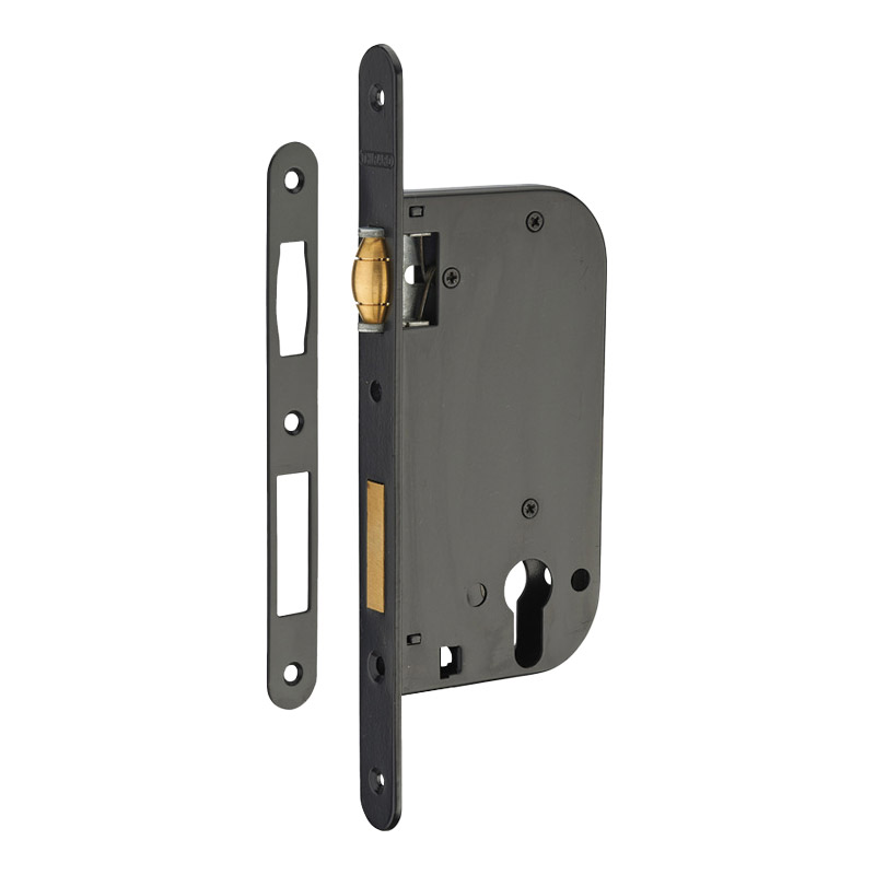 Sa têtière est en acier avec bouts ronds, son pêne rouleau en laiton et sa gâche plate en acier. Elle a un axe de 50 et est aussi destinée aux portes battantes, aux cylindres de profil européen.
