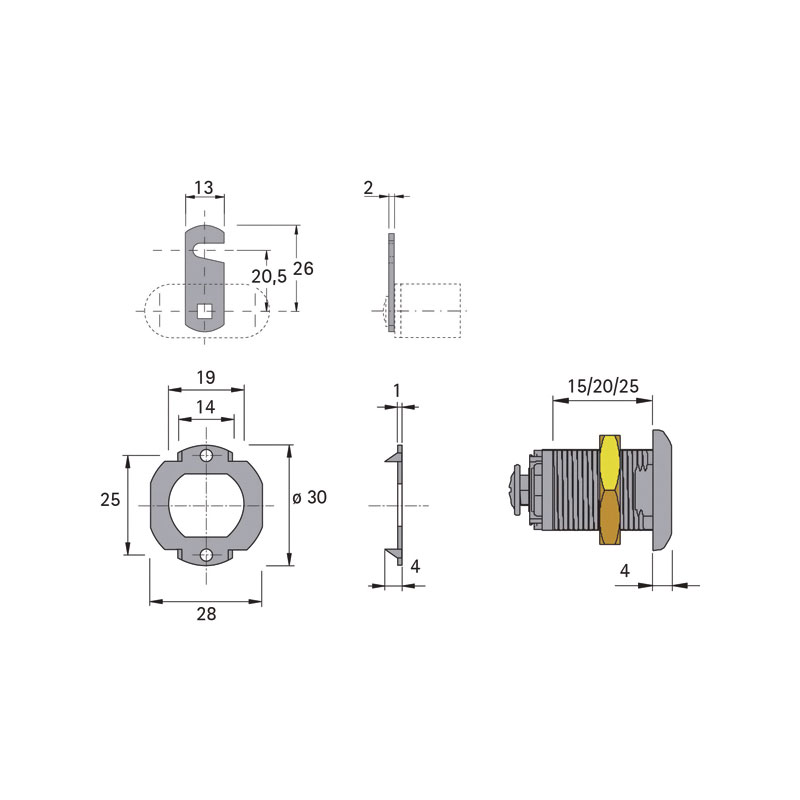 • Avec écrou de serrage, bague de blocage anti-rotation et came droite à crochet longueur 26