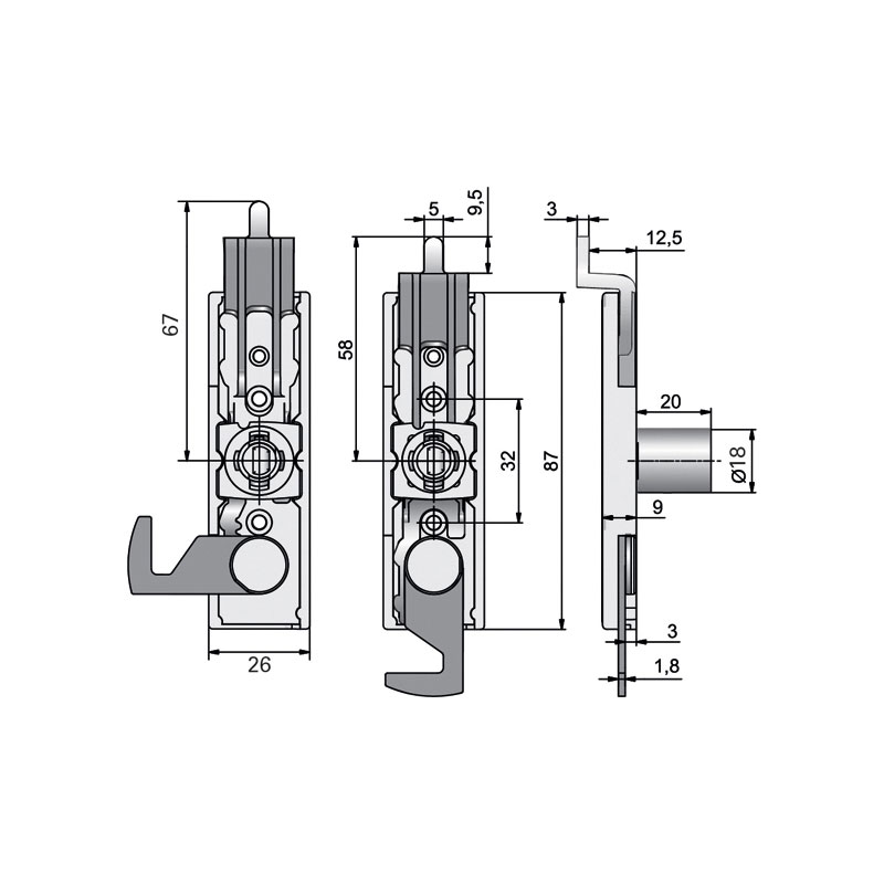 - Boitier zamac hauteur 87 mm, largeur 26 mm, épaisseur 9/14,5 mm