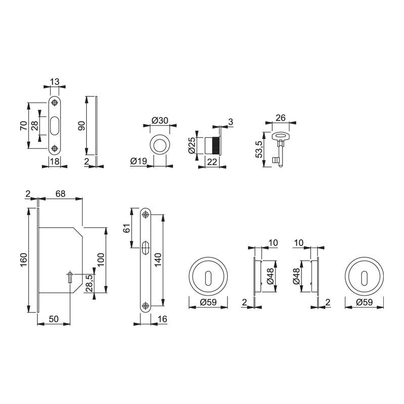 A) Clé L : Livrée avec clé rabattable (longueur 53,5 mm), gâche, rosaces, cuvettes et doigt de tirage.