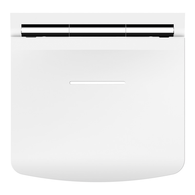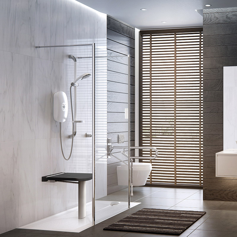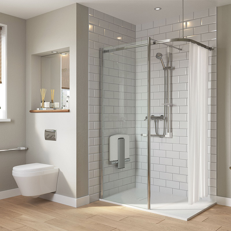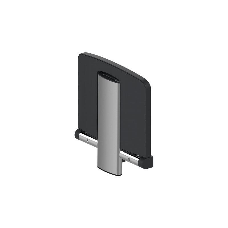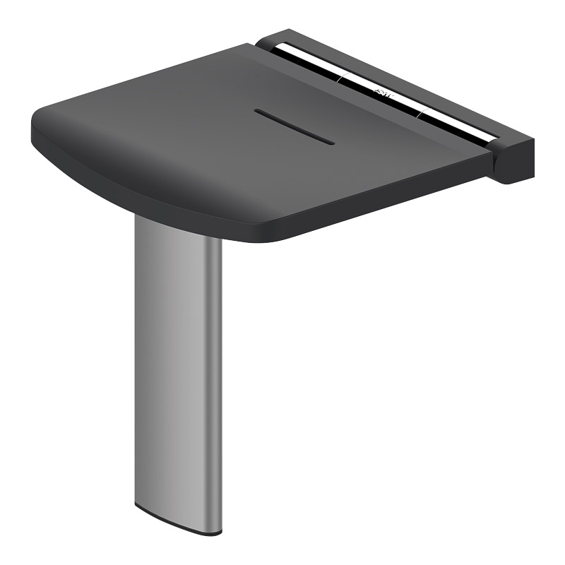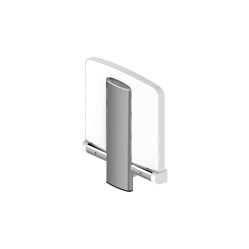 Siège de douche compact avec assise relevable, fermeture softclosing (fermeture en douceur) et pied repliable.