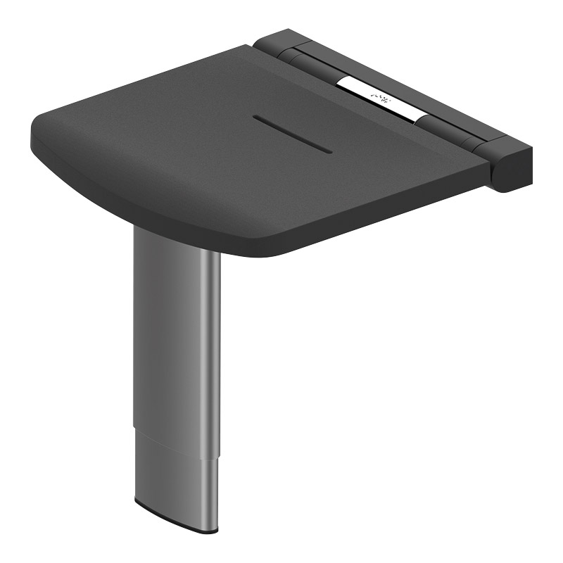 Siège de douche avec assise relevable, fermeture softclosing (fermeture en douceur) et pied repliable à hauteur réglable.