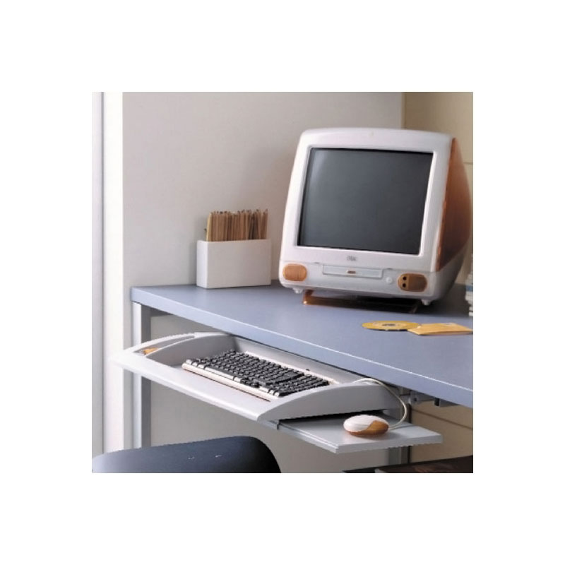 Il possède un plateau en PVC et une tablette à souris escamotable droite ou gauche montée sur des coulisses à galets en métal.