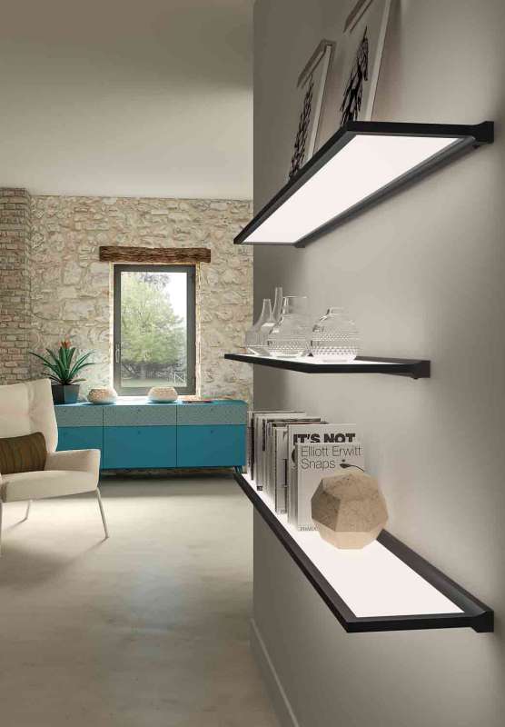 Etagère au look esthétique et contemporain avec un éclairage led homogène sur toute sa surface diffusant sa lumière vers le bas et vers le haut pour mise en valeur des articles exposés.