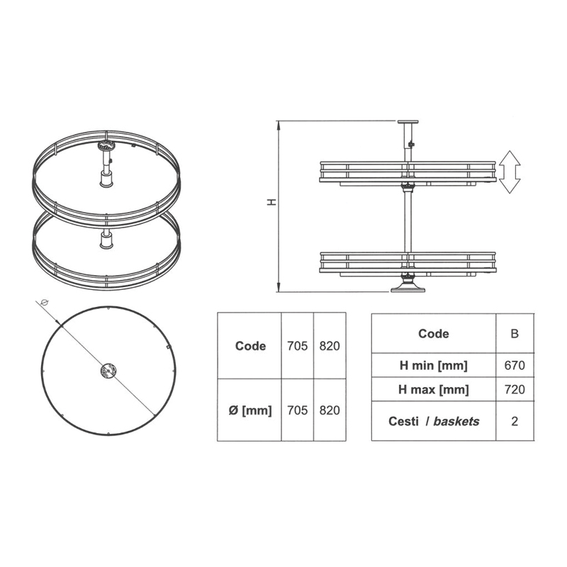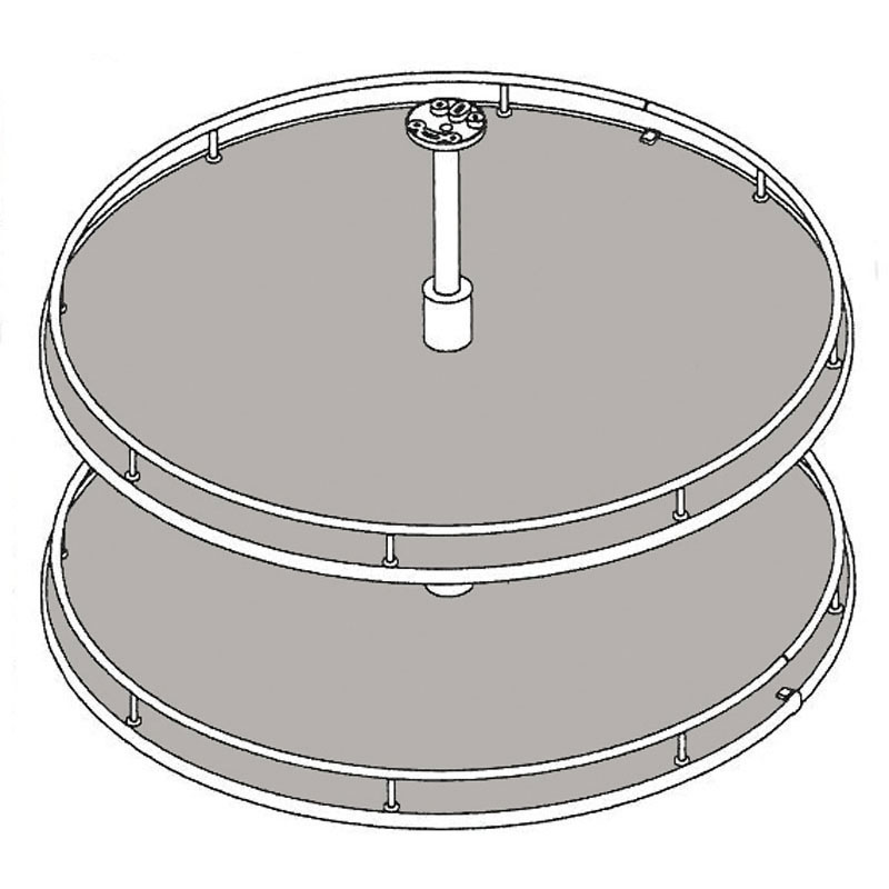 Constitué de deux plateaux ronds mélaminés avec bordure et galerie acier chromé, il dispose d'un axe réglable en hauteur 670 et 700 mm et d'une fixation haute et basse.