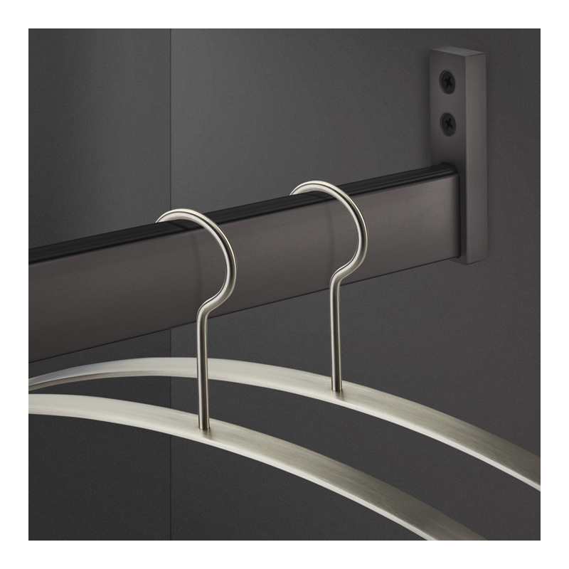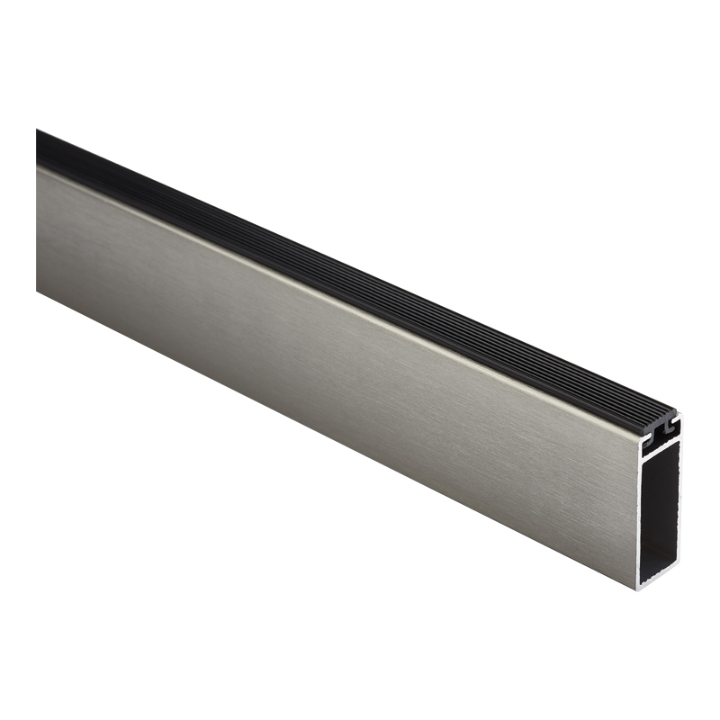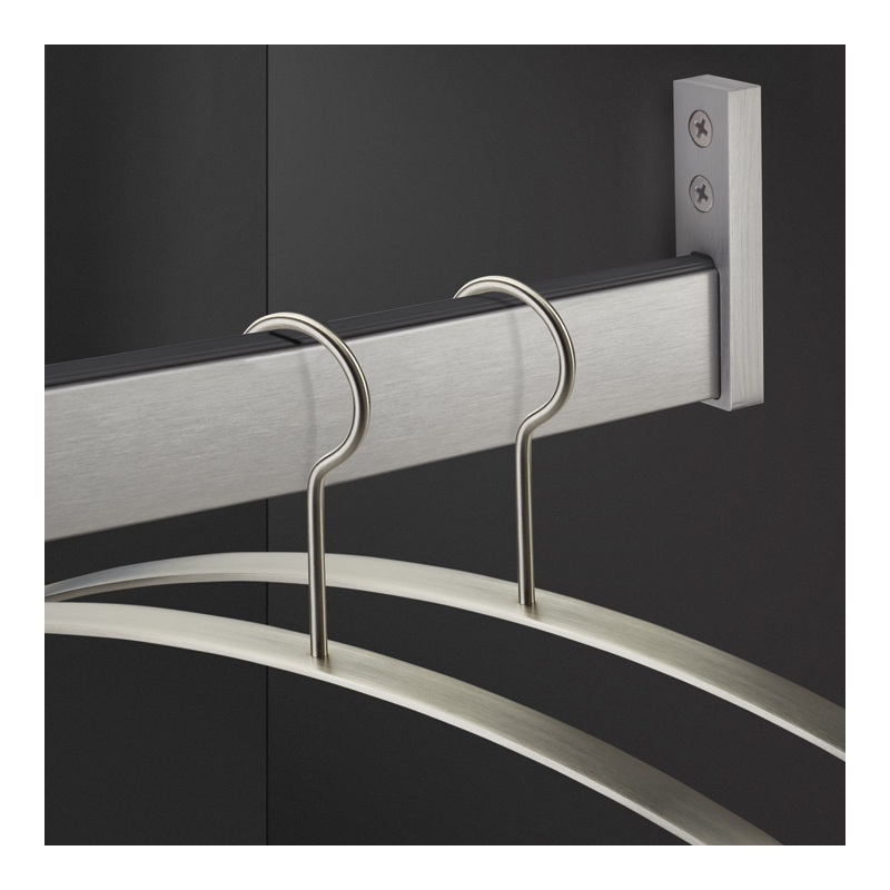 Tube de penderie rectangulaire en aluminium avec, en partie supérieure, un joint en plastique dur rainuré qui permet un déplacement fluide des cintres sans bruit.