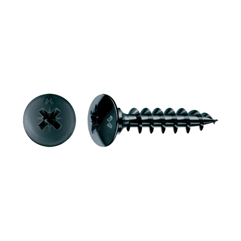 Vis Panelvit tête ronde large (pour un meilleur serrage) à empreinte cruciforme (PZ). Revêtement noir avec traitement anti-griffures.