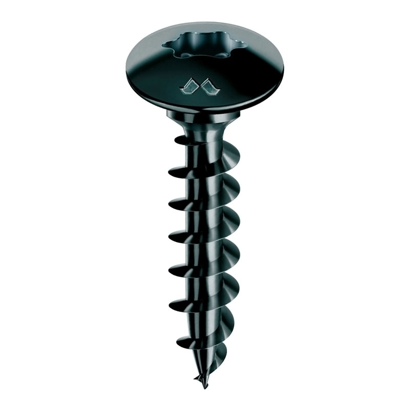 Vis Panelvit tête ronde large (pour un meilleur serrage) à empreinte Torx TX. Revêtement noir avec traitement anti-griffures.